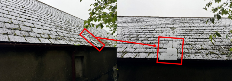External features - When we search for external features, we are mainly looking to identify parts of the building that a bat could use to gain entry into the structure to roost. Bats are much smaller than most people realise, and can squeeze into gaps as small as 2mm wide, so we use binoculars, zoom photography, a drone, and a trained eye to identify these features.